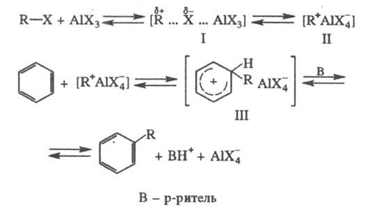 Механизм р-ции алкилирования предполагает, что сначала алкилгалогенид и катализатор образуют реагент (быстрая стадия), представляющий собой комплекс с переносом заряда (ф-ла I) или ионную пару (II), к-рый затем реагирует с ареном (медленная стадия), давая соед. III; перенос протона к р-ри-телю приводит к продукту р-ции. При проведении процесса без р-рителя или в слабоосновном р-рителе III - конечный продукт алкилирования, он распадается лишь при разложении реакц. массы: