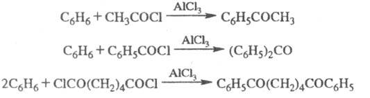 Ацилирование в условиях Фриделя - Крафтса реакции - основной метод синтеза ароматич. и жирноароматич. кетонов; при использовании хлорангидридов дикарбоновых к-т образуются дикетоны, напр.: