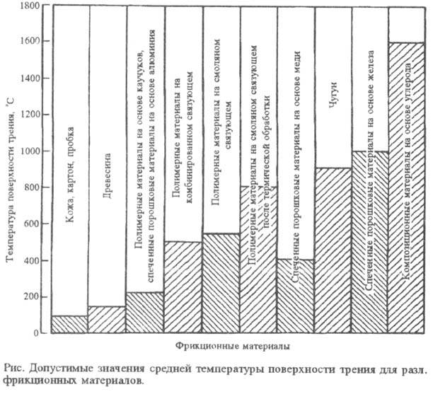 Различают фрикционные материалы для весьма легких (т-ра на пов-сти трения ниже 100 0C и т-ра в объеме тела не выше 50 0C), легких (соотв. 250 и 150 0С), средних (600 и 350 0C), тяжелых (1000 и 600 0C) и сверхтяжелых (более 1000 и более 600 0C) условий эксплуатации (рис.); работают в условиях сухого трения и в присут. смазочных жидкостей.