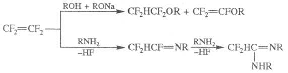 В отличие от нефторир. олефинов, фторолефины легко реагируют с нуклеофилами, образуя продукты присоединения и замещения, напр.: