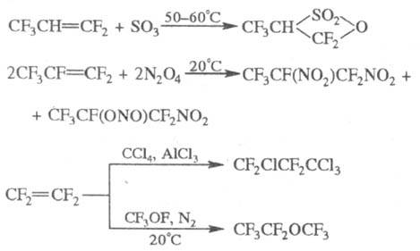 Фторолефины присоединяют по двойной связи неорг. оксиды, галоген-алканы и галогеналкены, гипофториты и др., напр.: