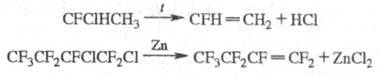 Осн. пром. метод получения фторолефинов- пиролиз фторхлоруглево-дородов при 750-850 0C либо дегалогенирование вициналь-ных полигалогеналканов металлами в метилформамиде, воде, спиртах, ТГФ и др., напр.: