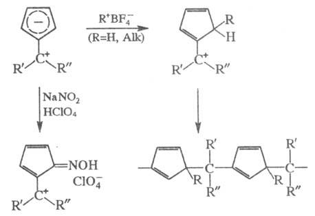Фульвены протонируются, алкилируются, нитрозируются; образующиеся фульвениевые соли устойчивы лишь при -80 С и легко полимеризуются: