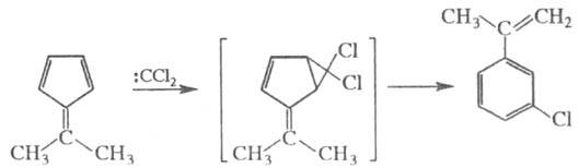 С дихлоркарбеном фульвены образуют 1,2-аддукты, к-рые перегруппировываются в производные бензола: