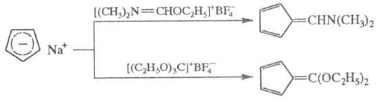 Получают фульвены конденсацией циклопентадиена с альдегидами и кетонами в присут. оснований. Для синтеза фульвенов, замещенных у атома С-6 на группу, содержащую гетероатом, используют иминиевые или карбоксониевые соли, напр.: