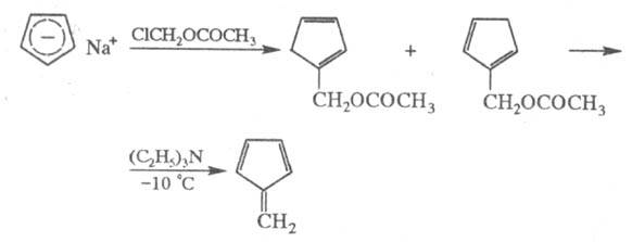 Незамещенный фульвен образуется с хорошим выходом при взаимод. хлор- или бромметилацетата с циклопентадиенил-натрием с послед, отщеплением уксусной к-ты: