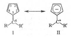 О вкладе структуры П свидетельствует наличие у фульвенов диполь-ного момента (для диалкил- и диарил-фульвенов m = 4,7·10-30 Кл·м); вклад этой структуры возрастает при наличии у атома С-6 электронодонорных заместителей.