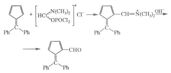 Фульвены способны к злектроф. замещению, напр. 6,6-дифенил-фульвен форматируется в циклопентадиеновый цикл комплексом Вильсмейера (хлороксид фосфора в ДМФА):