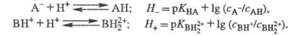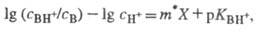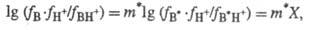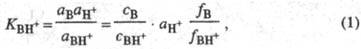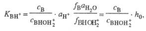 где аB, aH+ и аBH+ - термодинамич. активности соотв. основания В, протона H+ и протонир. формы BH+; с - их равновесные концентрации; f- коэф. активности.
