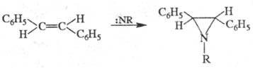 Присоединение нитренов к олефинам приводит к азириди-нам. Так, синглетный пентафторфенилнитрен с транс-стиль-беном дает соответствующий транс-азиридин; цис-стиль-бен - цис-азиридин, напр.: