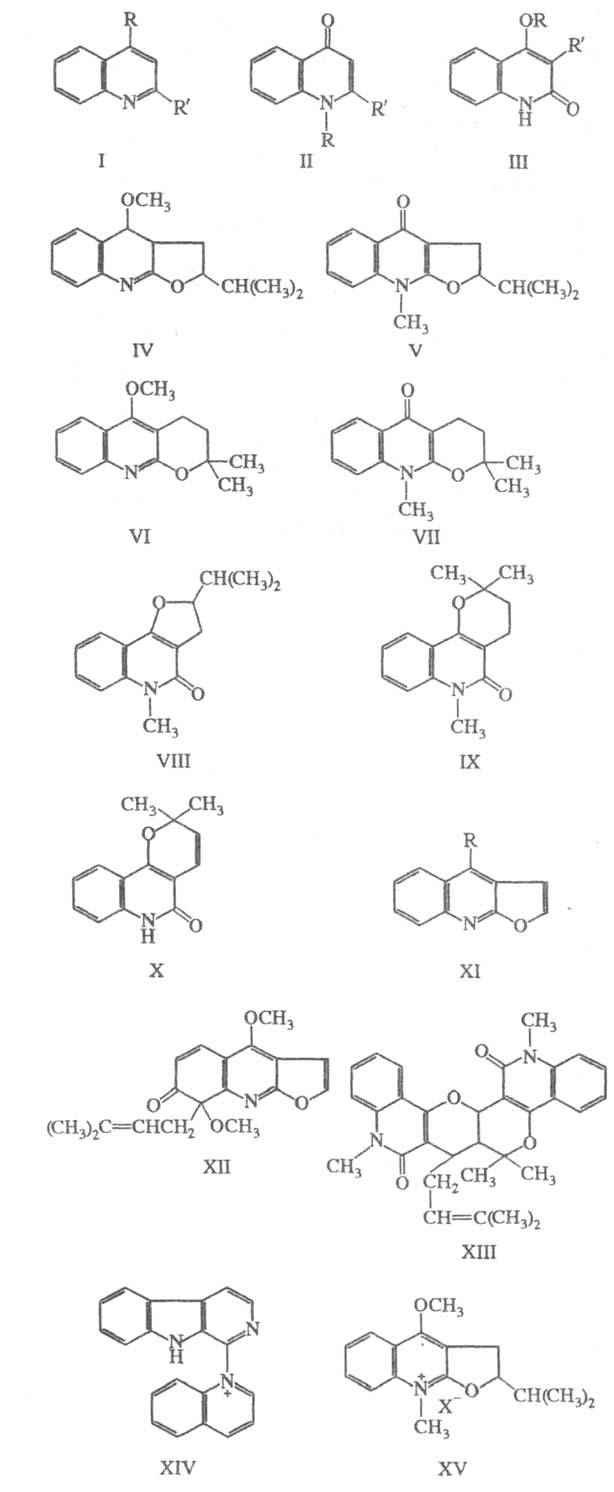 Различные хинолиновые алкалоиды имеют разных биогенетич. предшественников. Так биосинтез хинина и производных кинуреновой к-ты (I; R = ОН, R' = СООН) осуществляется из триптофана, а хинолиновых алкалоидов семейства рутовых (соед. I-ХIII, XV) - из антраниловой кислоты.