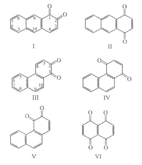 Наиб. практич. значение имеют бензохиноны, нафтохиноны, 9,10-антрахинон (см. Антрахинон), а также 1,2- и 1,4-антрахиноны (ф-лы I и II), 1,2-, 1,4- и 3,4-фенантрахиноны (ф-лы III-V, т. пл. 216, 153 и 133 °С, соотв.) и нек-рые дихиноны, напр. 1,4,5,8-нафтодихинон (VI).