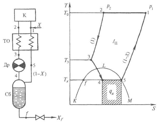 В установке с однократным, или простым, дросселированием (цикл Линде - Хемпсона; рис. 9) газ изотермически сжимается в компрессоре К (процесс 1-2), изобарно охлаждается в теплообменнике ТО до т-ры Т3, расширяется (при i = const) в дроссельном вентиле Др от давления сжатия р2 до давления всасывания pl (процесс 3-4); при этом газ частично конденсируется. Жидкость в кол-ве X [доля сжиженного газа по отношению к кол-ву дросселируемого; кол-во последнего принимают за единицу, на рис. обозначают (1)] в состоянии f выводится из сборника Сб, а пар в кол-ве (1-Х)возвращается через ТО в компрессор. В точке 1 к нему добавляется газ в кол-ве X, и цикл повторяется. Холодопроизводительность qx = Tх(S5 - S4) = i1 - i2 = i5 - i4 = X(i1 - if). Доля выводимого сжиженного газа Xf = (i1 - i2)/(i1— if);