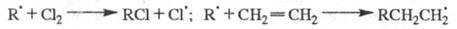 Для аналогичной р-ции с участием С12 необходимо затратить 248 кДж/моль, т. е. такая р-ция практически не происходит. Р-ции продолжения цепи для обеих систем подобны: