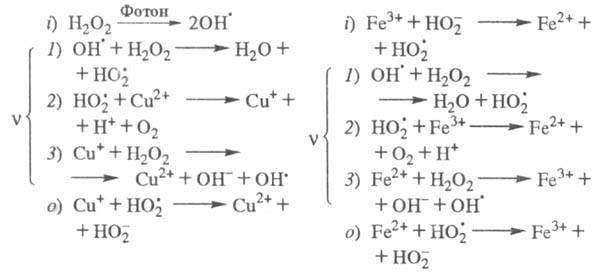 Продолжение цепи м. б. проиллюстрировано на примере процессов фотохим. разложения Н2О2 в присут. ионов Cu2+ и каталитич. разложения Н2О2 при добавлении в р-р ионов Fe3+, к-рые имеют схожие цепные механизмы (переносчики цепи -