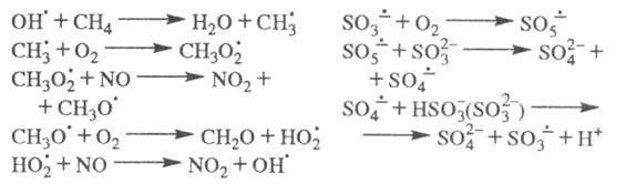 Многие атмосферные процессы относятся к цепным реакциям. Напр., в процессах соокисления метана и NO, образования H2SO4 в облачных каплях, содержащих