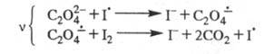 В период становления осн. понятий теории цепных реакций в качестве активных частиц рассматривались лишь атомы и своб. радикалы. В 30-х гг. Н. Н. Семенов предложил механизм цепных реакций с участием ион-радикалов и возбужденных молекул. Так, для окисления щавелевой к-ты иодом предложена след. цепь: