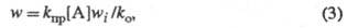 где g - т. наз. фактор гибели переносчиков цепи (фактор обрыва цепи), равный константе скорости kо обрыва цепи на стенке. Из (2) следует, что п = 0 при t = 0 и со временем п достигает значения wi /kо. Скорость цепной реакции w пропорциональна п и возрастает от w = 0 до значения, определяемого выражением: