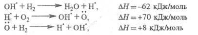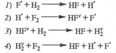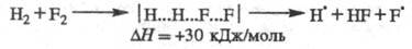 Имеются, однако, две возможности перехода колебат. энергии в хим. энергию активных частиц. Если энергия возбуждения конечного или промежут. продукта достаточна для его распада на активные частицы, может пойти р-ция размножения частиц. В рассматриваемых р-циях такая возможность отсутствует, т. к. соответствующие энергии связи составляют 565 (для Н — F) и 431 кДж/моль (для Н — С1), т. е. они больше, чем тепловые эффекты р-ций соотв. 2 и 2'.