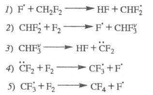 CF4 + 2HF был установлен механизм разветвления цепей в результате распада промежут. в-ва, образующегося в состоянии колебат. возбуждения: