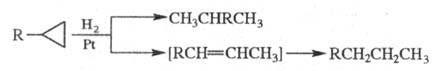 При действии Н2 алкилциклопропаны в мягких условиях подвергаются гидрогенолизу либо изомеризации с послед. гидрированием: