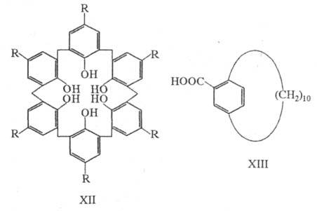 -электронной ареновой или гетареновой системы с др. кольцом, фрагментом мостика или заместителем на "противоположной" стороне макроцикла. В низших [2.2]пара- и метациклофанах и [3.3]пара- и метацик-лофанах наблюдается даже искажение планарности бензольных колец. Невозможность вращения ароматич. кольца в циклофанах приводит к существованию нек-рых монозамещенных, напр. кислоты ХIII, в виде оптич. изомеров. Функциональные замещенные циклофанов проявляют способность к образованию комплексов с ионами и молекулами по типу "хозяин - гость". Нек-рые из этих комплексов по сродству к ионам напоминают краун-эфиры. Напр., каликсарен XII (R = COOH) обладает значительно более высоким сродством и селективностью по отношению к катиону уранила по сравнению с др. соед.; такие циклофаны могут быть использованы для извлечения металлов из морской воды. Синтезированы комплексы, содержащие фрагменты циклофанов и краун-эфиров (кавитанды, карцеранды), представляющие интерес как системы для мол. распознавания.