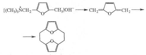 Получение. Циклофаны получают из производных ароматич. и гетероароматич. соединений. Так, [2.2]парациклофан м. б. синтезирован из 4,4'-дибромметил-1,2-дифенилэтана по р-ции Вюрца. Для получения высших парациклофанов используют циклизацию сложных эфиров в условиях внутримол. ацилоиновой конденсации. Специфич. метод получения [2.2]парациклофанов, [2,2]ортоциклофанов и их аналогов -расщепление четвертичных аммониевых оснований по р-ции Гофмана, напр.: