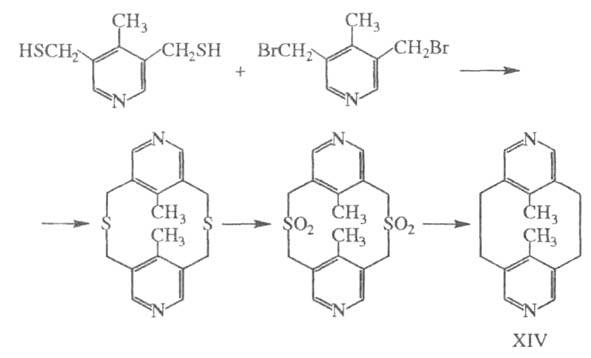 Третий путь синтеза - превращение одних циклофанов в другие. При этом наиб. значение имеет экструзия SO2 из макроциклич. сульфонов либо фотолитич. экструзия серы из тиациклофанов. Напр., пиридинофан XIV получают по схеме:
