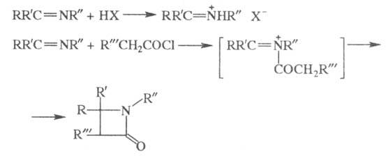 Электроф. реагенты реагируют с шиффовыми основаниями по атому N. С сильными к-тами и алкилгапогенидами образуются иминиевые соли (р-цию проводят в безводной среде из-за быстрого гидролиза последних); с хлорангидридами и ангидридами к-т - продукты присоединения, к-рые в присут. триэтиламина превращаются в азетидиноны, напр.: