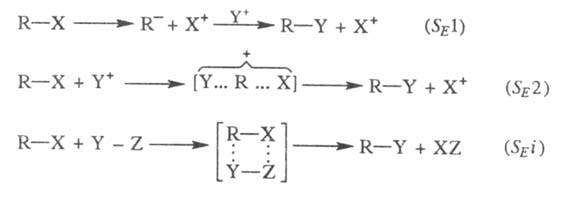 Возможны три механизма р-ций: мономолекулярный SE1 и бимолекулярные SE2и SE i: