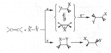 Весьма распространены р-ции электроф. присоединения к двойной и тройной связи С — С (АdЕ-реакции). Как правило, эти процессы рассматривают как двухступенчатые, на лимитирующей стадии к-рых образуется катионоидный интермедиат (ионный путь а):