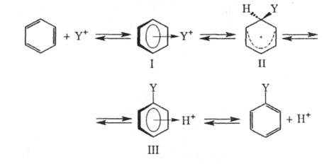 В начальной стадии электрофил Y+ образует с ароматич. субстратом промежут. комплекс (I). Обычно считают, что для ароматич. соед., активированных электронодонорными заместителями, структура (I) соответствует