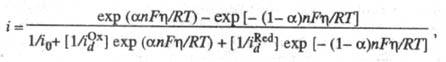 ; i0 - плотн. тока обмена, к-рая обусловлена константой скорости стадии разряда - ионизации, строением двойного электрич. слоя, зарядовыми числами частиц Ох и Red и их энергиями адсорбции на данном электроде. При учете стадии массопереноса ур-ние принимает вид:
