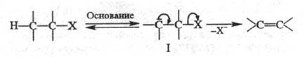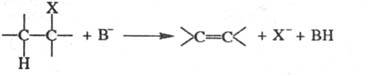 -элиминирования. Для них возможны 3 механизма - Е2, Е1 и Е1сВ (обозначение Е от англ. elimination). В р-циях бимол. элиминирования (механизм Е2) две группы отщепляются одновременно в одну стадию, при этом протон связывается с катализатором-основанием В: