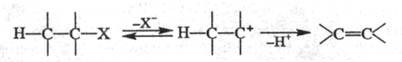 Мономол. механизм E1 - двухстадийный процесс, в к-ром медленная лимитирующая стадия - ионизация субстрата с образованием карбкатиона; последний быстро отдает протон основанию, к-рым часто служит р-ритель:
