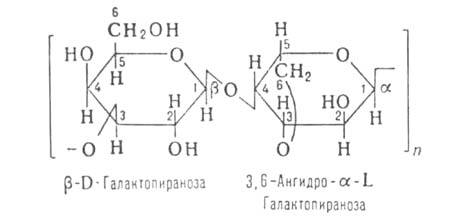 -D-галактозы, 2) остатками серной к-ты, связанными эфирной связью с разл. группами ОН, 3) заменой части остатков 3,6-ангидро