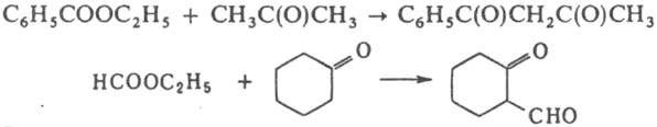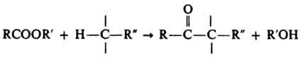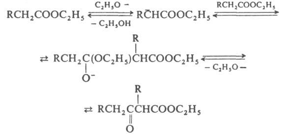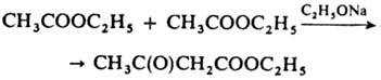 R и R'-opr. радикалы, R: - обычно COOAlk, C(O)Alk, CN. Для осуществления процесса исходные в-ва и катализатор (напр., Na, AlkONa, NaNH2, NaH) кипятят в осушенном инертном р-рителе (иногда до неск. сут). Для ускорения р-ции в ряде случаев образующийся спирт отгоняют в вакууме. При самоконденсации сложных эфиров образуются b-кетоэфиры. Таким образом получают, напр., ацетоуксусный эфир: