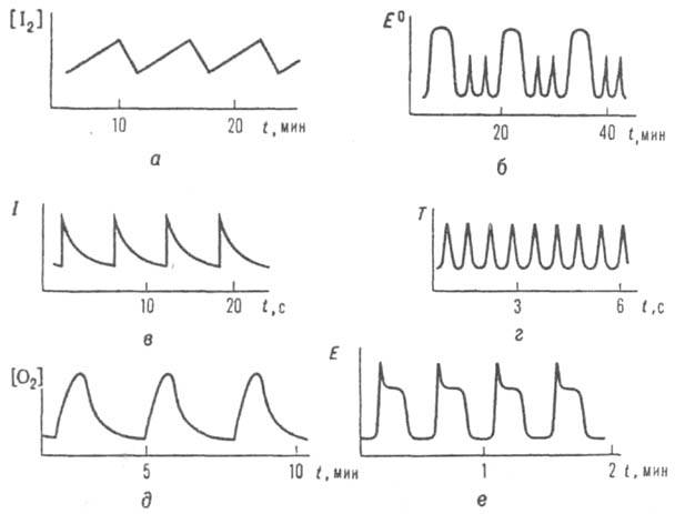 Рис. 3. Автоколебания в различных химимических системах: а колебания концентрации I2 при разложении Н2О2 в присут. IО3; 6 колебания окислит.-восстановит. потенциала E0 р-ра при окислении S2O32- хлоритом; в колебания интенсивности I хемилюминесценции при газофазном окислении СО; г - колебания т-ры DT0 при газофазном окислении СН3СНО; д - колебания конц. О2 при окислении Н2 на Ni; е - колебания электродного потенциала E при растворении Fe в HNO3.
