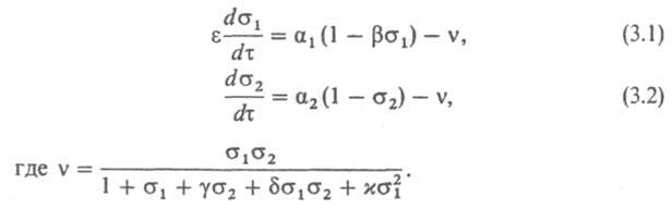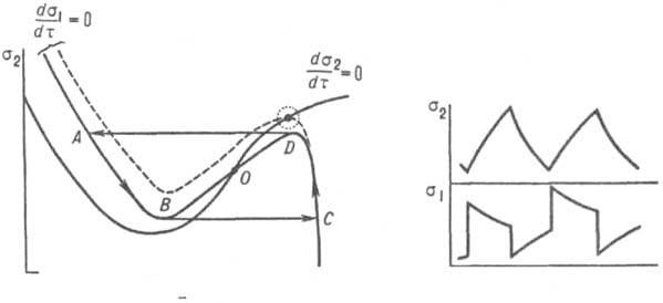 и s103. На кривой зависимости стационарной концентрации s10 от a1 (рис. 1, б) область с тремя стационарными состояниями лежит в интервале (a'1, a''1). При прямом и обратном медленном изменении параметра a1 происходит движение системы по различным траекториям, т.е. гистерезис. Следует отметить, что описанную бистабильность можно получить в системе с односубстратной р-цией, к-рая ведет себя аналогично двухсубстратной р-ции с фиксир. концентрацией одного из субстратов. Чтобы система с одной переменной и бистабильностью стала колебательной, нужно превратить параметр в медленную переменную. В ферментативной системе с двумя субстратами таким параметром, естественно, является концентрация второго субстрата s2. В этом случае для описания системы нужно использовать оба ур-ния (3). Относительные изменения концентрации S2(D[S2]/[S2]) будут медленными по сравнению с относительными изменениями Sl, если [S2]>>[S1]. При переходе к безразмерным параметрам это условие принимает след, вид: a1~a2~1, e<<1. На фазовой плоскости с координатами s1, s2 поведение системы качественно определяется взаимным расположением нуль-изоклин-кривых, на к-рых производные ds1/dt и ds2/dt равны 0 (рис. 2, а). Точки пересечения нуль-изоклин соответствуют стационарным состояниям системы. Пунктиром показано положение нуль-изоклины ds1/dt=0 при бифуркации, сопровождающейся возникновением устойчивых колебаний (автоколебаний) малой амплитуды. Этим колебаниям соответствует замкнутая траектория движения системы - т. наз. предельный цикл. Сплошными линиями показаны нуль-изоклины в ситуации, далекой от бифуркации, когда единственное стационарное состояние системы (точка О на рис. 2, а) сильно неустойчиво и окружено предельным циклом ABCD. Движению системы по этому предельному циклу соответствуют автоколебания концентраций s1 и s2 с большой амплитудой (см. рис. 2, б).