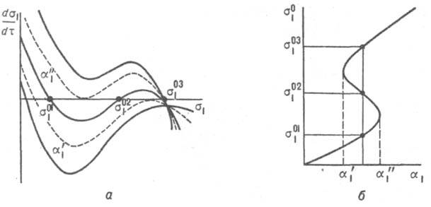 Рассмотрим случай, когда эта система имеет два устойчивых стационарных состояния - бистабильную систему, или триггер. Если a2>>a1/e, т.е. скорость р-ции S02DS2 очень велика по сравнению со скоростью р-ции S01DS1 и скоростью ферментативной р-ции, то [S2] постоянна и равна [S02]. В этом случае поведение системы описывается только одним ур-нием (3.1). Зависимости dsl/dt от s1 при разных значениях a1 показаны на рис. 1, а. Пунктирные кривые соответствуют бифуркац. значениям параметра a-a'1 и a:1, а кривые, заключенные между ними, трижды пересекают ось абсцисс. Точки пересечения соответствуют стационарным состояниям s101, s102 и s103, среднее из к-рых s102 неустойчиво и разделяет области притяжения устойчивых состояний s101