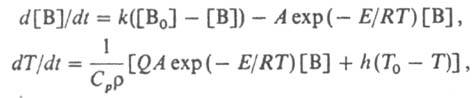 В ходе колебательных реакций наблюдались периодич. колебания разл. формы: синусоидальные, пилообразные, прямоугольные и т.д.; модулированные, квазипериодические и стохастические. Периоды большинства колебательных реакций лежат в диапазоне от долей секунды до десятков минут. К жидкофазным колебательным реакциям относятся, напр., диспропорционирование Н2О2 и S2O42-, окисление разл. в-в галогенкислородными соед., окисление углеводородов и сульфидов кислородом. Хорошо изучена Белоусова - Жаботинского реакция, идущая в водном р-ре, где НВrO3 при катализе ионами металлов переменной валентности окисляет разл. орг. соед., в частности малоновую к-ту. Газофазные колебательные реакции обнаружены и исследованы при окислении паров фосфора, углеводородов, СО и др. соединений. Во всех случаях существенны как объемные стадии р-ции, так и обрыв и зарождение цепей на стенках реактора, а также ускорение р-ций за счет разогрева системы в результате экзотермич. стадий (тепловой автокатализ). Возможны чисто термокинетич. автоколебания, когда тепловой автокатализ является единств, причиной неустойчивости. Простейшая модель термокинетич. колебаний в проточном реакторе имеет вид: В0:В:Р+Q. Здесь в-во В поступает в проточный реактор идеального смешения, где происходит мономолекулярная экзотермич. р-ция распада; выделяющееся тепло отводится через стенку реактора. Кинетика этой р-ции описывается двумя дифференц. ур-ниями относительно концентрации В и т-ры Т внутри реактора: