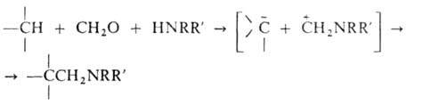 1) соед., содержащих активированный атом Н, с формальдегидом и NH3 или аминами (Манпиха реакция):