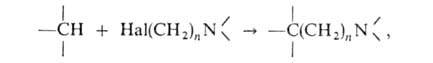 2) аминоалкилгалогенидов с соед., содержащими подвижный атом Н, напр. с бензилцианидом, инденом, флуореном, в присут. оснований (КОН, NaOH, NaNH2 и др.):