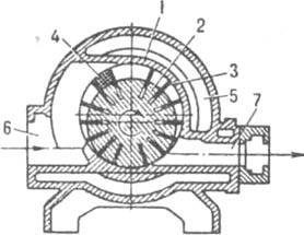 Рис. 3. Пластинчатый компрессор: 1 - корпус; 2 ротор; 3 - пластина; 4 камера сжатия; 5 - охлаждающая рубашка; 6. 7 - всасывающий и нагнетательный патрубки.