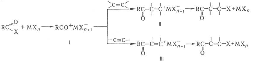 Механизм Кондакова реакции включает генерирование высокореакционноспособного ацилиевого комплекса I (МХn - к-та Льюиса), к-рый взаимод. с олефином с образованием карбкатионов II или III. В р-ции, подобной Кондакова реакции, в качестве ацилирующего агента используют ангидрид уксусной к-ты; при этом образуются те же продукты р-ции, что и в случае ацетилхлорида. При использовании в качестве катализатора H2SO4 обычно образуются непредельные кетоны. Р-ция открыта И. Л. Кондаковым в 1893 и позднее изучалась С. Г. Крапивиным, А. Н. Несмеяновым и Н. К. Кочетковым; с ацетиленовыми углеводородами ее впервые провели в 1934 А. Корнилло и Р. Алкейр. Лит.. Кочетков Н. К., "Успехи химии". 1955, т. 24, в. 1, с. 32-51; Белов В. Н., Рудольфи Т. А., в кн.: Реакции и методы исследования органических соединений, кн. 7, М., 1958, с. 255-76. Н.Э. Нифантьев.