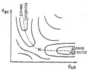 в минимум, отвечающий продуктам. Координата реакции определяется как длина дуги s(q,q') на кривой пути р-ции, отсчитанная от начальной точки q' до любой точки q, лежащей на этой кривой. В точке перевала координата реакции