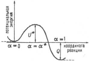 Рис. 2. Сечение поверхности потенциальной энергии вдоль пути р-ции. Реагентам и продуктам соответствуют минимумы при а=0 и а=1 (два изомера в случае изомеризации). Если долине реагентов или продуктов соответствуют дв" мол. фрагмента со свободным относит. движением, минимумы вырождаются в горизонтальные асимптотич. полупрямые (показаны пунктиром).