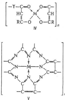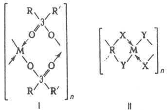 КООРДИНАЦИОННЫЕ ПОЛИМЕРЫ (внутрикомплексные полимеры, хелатные полимеры, клешневидные полимеры), высокомол. соед., основная цепь к-рых построена из хелатных колец (см. Координационные соединения, Хелаты), Чаще всего координационные полимеры образуют катионы переходных металлов, хотя известны координационные полимеры металлов почти всех групп (кроме пятой) периодич. системы. Небольшие размеры катионов переходных металлов в сочетании с большим эффективным зарядом, а также наличие в ряде случаев незаполненных d-орбиталей обеспечивают довольно прочную связь металла с донорными группами лиганда. По строению осн. цепи различают координационные полимеры с основными неорг. цепями (ф-лы I) и элементоорг. цепями (II).