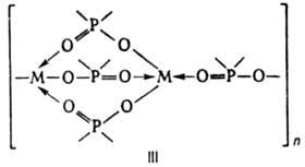 М-атом металла, Э-атом кислотообразующего элемента, напр. Р, As или S; R и R'-opг. остатки; X=О, S, NR:; Y=CO, NR:, NO, CS. Св-ва координационных полимеров значительно отличаются от св-в высокомол. соед., не содержащих в макромолекуле атома металла. Большинство координационных полимеров имеет относительно невысокие мол. массы и поэтому для них характерны, напр., невысокая мех. прочность, неспособность к волокно- и пленкообразованию. Многие из них имеют характерную окраску (напр., поли-фосфинаты Со - голубого цвета, фталоцианины - синего или зеленого). Координационные полимеры могут быть линейной, лестничной или сетчатой (трехмерной) структуры. Неплавкость и нерастворимость большинства координационных полимеров ограничивают их исследование и широкое применение. Из координационных полимеров с основными неорг. цепями (полифосфинаты, политиофосфинаты, полиарсинаты металлов и др.) наиб. полно исследованы полифосфинаты металлов, т.к. нек-рые из них способны течь под нагрузкой и раств. в обычных орг. р-рителях. Ряд полифосфинатов металлов (ф-ла I; Э=Р) обладает высокой тепло- и термостойкостью; термич. разложение начинается с отщепления орг. заместителей у атома Р или дополнит. лигандов, связанных с атомом металла (осн. цепь не затрагивается). Для них наиб. характерна кристаллич. структура; в аморфное состояние м. б. переведены быстрым охлаждением их расплавов. Аморфные по-лидиалкилфосфинаты Zn и Со обладают высокой морозостойкостью. Полидифенилфосфинаты в зависимости от природы металла по т-рам 10%-ного уменьшения массы в инертной атмосфере (скорость подъема т-ры 5° С/мин) образуют ряд: Mn (580°C)>Zn (520°C)>W (510°C)>Fe (453 °С) > Mo (425 °С) > Сг (390 °С). Нек-рые полифосфинаты типа МХ2 (М-двухвалентный металл, Х-анион фосфиновой к-ты) имеют структуру III (напр., монокристаллы полидиалкилфосфинатов Zn). Аморфные полифосфинаты двухвалентных металлов, имеющие достаточно гибкие полимерные цепи (благодаря возможности вращения вокруг связей Р—О и О—М), проявляют эластич. св-ва. Координационные полимеры с осн. элементоорг.