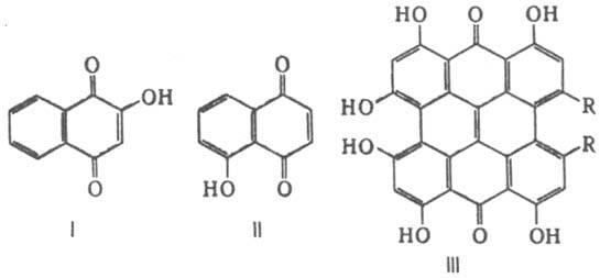 КРАСИТЕЛИ ПРИРОДНЫЕ, орг. соединения, к-рые вырабатываются живыми организмами и окрашивают животные и растит. клетки и ткани. В осн. соединения желтых, коричневых, черных и красных цветов разных оттенков, очень мало синих и фиолетовых, зеленые, как правило, отсутствуют. До 2-й пол. 19 в. красители природные - единств. в-ва для крашения текст. и парфюм. изделий, кожи, бумаги, пищ. продуктов и др. С развитием пром. орг. синтеза, особенно анилинокрасочной пром-сти, красители природные не выдержали конкуренции с красителями синтетическими и в осн. утратили былое практич. значение. В небольших кол-вах красители природные используют в реставрац. работах. Их применяют также в пищ. и парфюм. пром-стях, при исследованиях методами оптич. и электронной микроскопии в цитологии и гистохимии, в аналит. химии. Многие красители природные обладают значительной физиол. и антибиотич. активностью, вследствие чего их часто используют как лек. ср-ва. Нек-рые красители природные - регуляторы роста растений, а также сигнальные в-ва, привлекающие насекомых-опылителей и отпугивающие вредителей. Красители природные широко распространены в природе и крайне многообразны. Часто в разл. прир. источниках встречаются одни и те же или близкие по строению красители природные, поэтому наиб. целесообразно классифицировать их по типам хим. соединений. Алифатические и алициклические красители. Включают каротиноиды, обусловливающие желтую, оранжевую и красную окраски цветов и плодов. С удлинением цепи сопряженных двойных связей окраска углубляется. Среди красителей природных этого ряда - углеводороды (здесь и ниже в скобках указан цвет кристаллов), напр. ликопин (красный), a-, b- и g-каротины (фиолетовый); спирты, напр. криптоксантин и ксантофил (желтый), зеаксантин (желтовато-красный); кетоны, напр. родоксантин (синевато-черный) и астицин (фиолетовый); кето-спирты, напр. кантаксантин и астаксантин (красный); альдегиды, альдегидоспирты и др. Встречаются каротиноиды в растит. и животном мире. Многие из них, напр. каротин, обладают высокой физиол. активностью, ретиналь (альдегид, образующийся из витамина А) входит в состав зрительного белка родопсина. К полиенам относится ряд антибиотиков (канацидин, пентамицин, трихомицин и др.), продуцируемых актиномицетами, гл. обр. разл. видами Streptomyces. Ароматические красители. В осн. это гидрокси- и алкокси-замещенные непредельные кетоны: 1) производные коричной и феруловой (4-гидрокси-З-метоксикоричной) к-т-4,4'-дигидроксидициннамоилметан (желтый), 4-гидроксициннамоилферулоилметан (оранжевый) и диферулоилметан, или куркумин (оранжево-красный), встречающиеся в корнях куркумы (Curcuma longa, С. tinctoria), и др.; 2) производные халкона С6Н5СН=СНСОС6Н5 и хинонов-1,4-бензохинона, 1,4- и 1,2-нафтохинонов, антрахинона, а также антрона, напр. лавсон (ф-ла I) и юглон (II), выделенные соотв. из листьев хны (Lawsonia inermis) и из кожуры незрелых грецких орехов (Inglans regia), - желтые красители для шерсти и шелка; хризаробин (1,8-дигидрокси-З-метил-9-антрон) - желтый краситель бразильских видов древесины (напр., Andira araroba): эмодинантрон (1,6,8-тригидрокси-3-метил-9-антрон) - желтый краситель древесины жостера даурского (Rhamnus dahurica); гиперицин (III; R=СН3) и псевдогиперицин [III; R=СН(ОН)СН3] - темно-фиолетовый и темно-красный красители цветов зверобоя продырявленного (Hypericum perforalum), обладающие способностью убивать микроорган